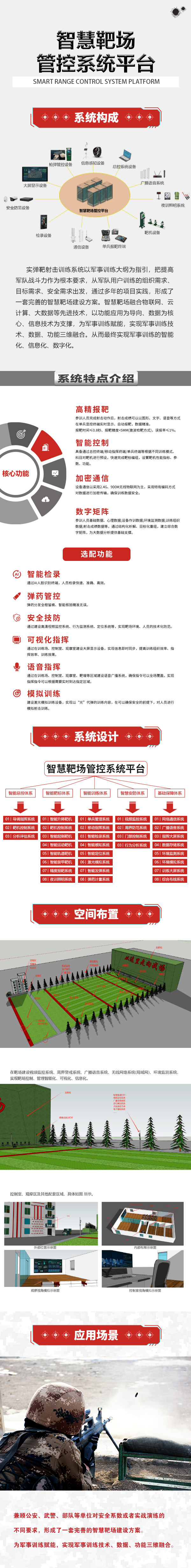 参数:实弹靶射击训练系统以军事训练大纲为指引,把提高军队战斗力作为根本要求,从军队用户训练的组织需求、目标需求、安全需求出发,通过多年的项目实践,形成了一套完善的智慧靶场建设方案。智慧靶场融合物联网、云计算、大数据等先进技术,以功能应用为导向、数据为核心、信息技术为支撑,为军事训练赋能,实现军事训练技术、数据、功能三维融合。从而最终实现军事训练的智能化、信息化、数字化。